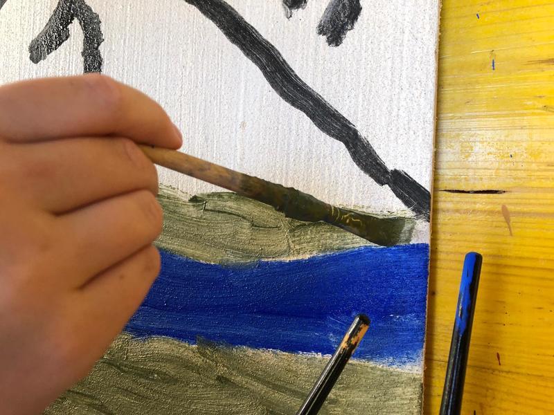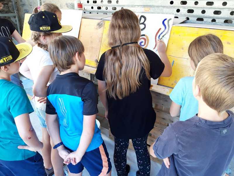 An einem Posten konnten sich die Schülerinnen und Schüler alsKünstler versuchen und nach ganz alter Technik eine Freske auf mit feuchtem Kalkputz bestrichenn Untergrund malen. Jede Gruppe hat ein Gemeinschaftswerk geschaffen.